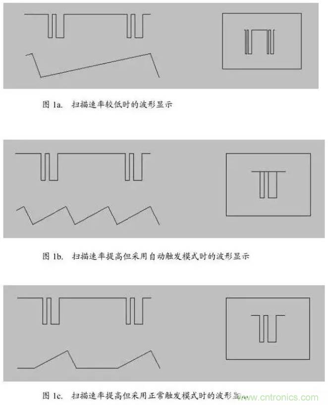 圖1 是這種情況的圖解,在圖1 中,左側(cè)上方是被觀測的波形,下方是掃描波形,右側(cè)是波形的顯示。圖1a中掃描速率較低,不便于觀察波形的細(xì)節(jié);圖1b將掃描速率提高,采用自動觸發(fā)模式,這時顯示的波形是不清晰的,有混疊現(xiàn)象;圖1c中的掃描速率與圖1b相同,但采用正常觸發(fā)方式,僅在有觸發(fā)時才進(jìn)行掃描,因而顯示清晰的波形。