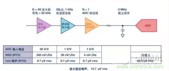 圖1顯示了過采樣系統(tǒng)中的情況。從噪聲頻譜密度看,系統(tǒng)總噪聲似乎以增益放大器為主,但一旦考慮帶寬,各級貢獻(xiàn)的rms噪聲其實非常相近。