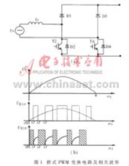 圖1(a)所示為工作在PWM整流狀態(tài)的H型橋式PWM變換電路(此圖為正弦波正半波輸入下的等效電路,上半橋的兩只IGBT未畫(huà)出),圖1(b)為下半橋兩只大功率器件的驅(qū)動(dòng)信號(hào)和相關(guān)的器件波形?,F(xiàn)以正半波工作過(guò)程為例進(jìn)行分析(對(duì)于三相PWM電路,在整流、逆變工作狀態(tài)或單相DC/DC工作狀態(tài)下,PWM電路的分析過(guò)程及結(jié)論基本類似)。