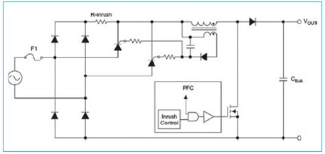 圖 3 顯示了為克服 NTC 中許多惱人問(wèn)題的實(shí)施方案。這種實(shí)施方案就是既可選擇固定阻值的電阻,也可選擇 NTC 作為浪涌電阻。這里所闡述的浪涌電路具有兩只額外的硅控整流器 (SCR) 和一個(gè)來(lái)自 PFC 升壓電感小輔助繞組的非穩(wěn)壓電壓源。