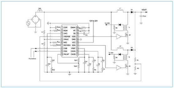 圖 3 顯示了業(yè)界首款單芯雙相交錯(cuò)式 PFC 預(yù)調(diào)節(jié)器——TI UCC28070 的簡(jiǎn)化原理圖。交錯(cuò)雙相相互之間的相位差為 180°,這樣則消除了波紋電流,從而可以使用更小的電磁干擾 (EMI) 濾波器以及外觀更小巧的 PFC 輸出電容器。雙相交錯(cuò)式拓?fù)浣Y(jié)構(gòu)、體積更小的元件是嵌入式馬達(dá)驅(qū)動(dòng)電路的理想解決方案。交錯(cuò)式 PFC 可滿足非常高的功率密度要求。