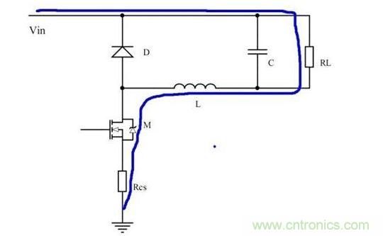 接下來的開關(guān)周期內(nèi),電感通過二極管D續(xù)流,如圖3所示。這就出現(xiàn)了一個問題,此時的電流不再流經(jīng)開關(guān)管,控制電路無法知道電流下降到何種程度了。
