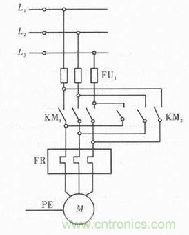 在眾多的操作系統(tǒng)中均要求電動機能夠實現(xiàn)正反轉給操作,從電動機的工做原理中可知,需將三相電源中的任意兩個進行對調,就能實現(xiàn)電動機的反向運轉,因此電動機實現(xiàn)正反轉的實質便是電源進線的調換。但若僅調換進線,容易導致電源短路,因此必須設置互鎖,圖2是三相異步電動機正反轉的原理設計圖,圖中KM1和KM2均是交流接觸器主觸頭,當KM1吸合時,KM2交流接觸器主觸頭就會斷開,然后便可實現(xiàn)電機的正轉。若是斷開交流接觸器主觸頭KM1,KM2就會吸合,此時電動機則會實現(xiàn)反轉,圖中的FU1主要用于防止電源短路,圓形代表電機M。