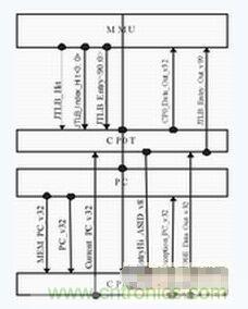 協(xié)助TLB進行虛實地址轉(zhuǎn)換是CP0的主要功能之一。TLB屬于系統(tǒng)的特權(quán)資源,只有CP0有權(quán)對其進行訪問,因此CP0與TLB之間的連線較多,數(shù)據(jù)交換的時延也比較關(guān)鍵。同時,PC模塊與CP0的數(shù)據(jù)交換也非常重要。因此,CP0單元在版圖上最好同時靠近TLB和PC模塊。本設(shè)計將CP0中與TLB相關(guān)的邏輯與寄存器獨立為CP0T,放在MMU與PC模塊之間;CP0的其余部分歸為CP0E,放在PC下部,也就是整塊芯片的最下端。如下圖所示?! ?/div>