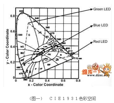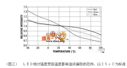 這類LED光源的簡單開迴路架構(gòu)方式有個(gè)潛在的問題,由于LED的光學(xué)特性會(huì)受到運(yùn)作條件的影響,因此組合后的RGB光源輸出的亮度以及色度都會(huì)變化。同時(shí),每顆LED元件也不盡相同,因此造成RGB光源的輸出產(chǎn)生更多變化,(圖二)與(圖三)就描述了幾個(gè)LED變動(dòng)的范例。