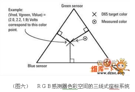 基本上來說,三色光感測器會(huì)產(chǎn)生一個(gè)三維色彩規(guī)格系統(tǒng),因此稱為RGB感測器色彩空間,這個(gè)系統(tǒng)可以讓特定色彩由感測器的輸出電壓來指定,例如具備特定亮度的D65白光可以記錄為:(Vred, Vgreen,?。郑猓欤酰澹剑ǎ玻?,?。玻?, 1.9)volts。