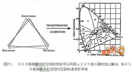 系統(tǒng)A中的三色光感測器在達(dá)成D65光輸出時(shí),會(huì)產(chǎn)生以上的電壓位準(zhǔn),但對(duì)系統(tǒng)B的光感測器,雖然達(dá)到和A系統(tǒng)一樣的D65光輸出,卻會(huì)產(chǎn)生不同的電壓位準(zhǔn)組合。換句話來說,由RGB感測器色彩空間所定義的色彩規(guī)格系統(tǒng)在每個(gè)系統(tǒng)都不一樣。