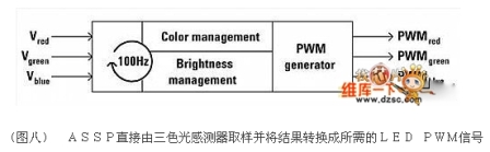 ASSP整合了一系列可以分析三色光感測器色彩資訊,并計(jì)算達(dá)成目標(biāo)色的設(shè)定點(diǎn)及PWM驅(qū)動(dòng)信號(hào)大小的一系列演算法。ASSP以大約每秒一百次的速度對(duì)光感測器進(jìn)行取樣,以確保PWM信號(hào)的持續(xù)定期調(diào)整不會(huì)被人眼察覺,如前面所提,ASSP同時(shí)也包含一個(gè)可以避免LED老化而造成RGB光源輸出色度改變的演算法。