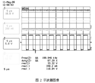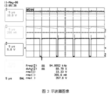 圖 2 、圖3 及表 2、表3 顯示了這種電路在90 ~265 VAC的通用輸入電壓范圍內(nèi),以350 mA驅(qū)動兩個有6個串聯(lián)LUXEON FLOOD 25-0032 HB-LED板時的結(jié)果。表 2 顯示了在輸入電壓范圍內(nèi)良好的電流調(diào)節(jié)。圖 2 和圖3 說明了正如理論所示的,由于占空比較小,輸入電壓較高時紋波較差。這表明在主電壓較低的地區(qū),如北美和日本,設(shè)備性能更加良好。然而,即使在最差的條件下,只要控制器輸入電壓保持在90 ~265 VAC的范圍內(nèi),仍可對電流進(jìn)行適時調(diào)節(jié)。同時對只使用6個HB-LED板的系統(tǒng)進(jìn)行了測量(見表 3) ,對比結(jié)果發(fā)現(xiàn),±1.3%的調(diào)節(jié)差距導(dǎo)致負(fù)載電壓的差距高達(dá)33.4V ~16.4V。