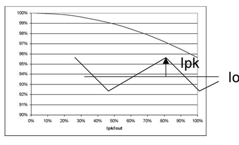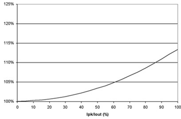 圖4 也闡明了即使在紋波電流較大的時候,對功耗也沒有重大影響。例如,50%的紋波電流僅增加不足5%的功率損耗。當大大超過此水平時,需要減小電源的DC電流以保持結(jié)溫不變,從而維持半導體的使用壽命。經(jīng)驗法則顯示,結(jié)溫每降低10%,半導體使用壽命就會延長兩倍。并且,許多設(shè)計都傾向于更小的紋波電流,這是因為電感器的限制。絕大多數(shù)電感的設(shè)計處理能力小于20%的Ipk/Iout紋波電流比率。