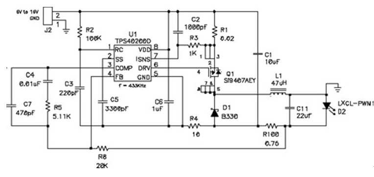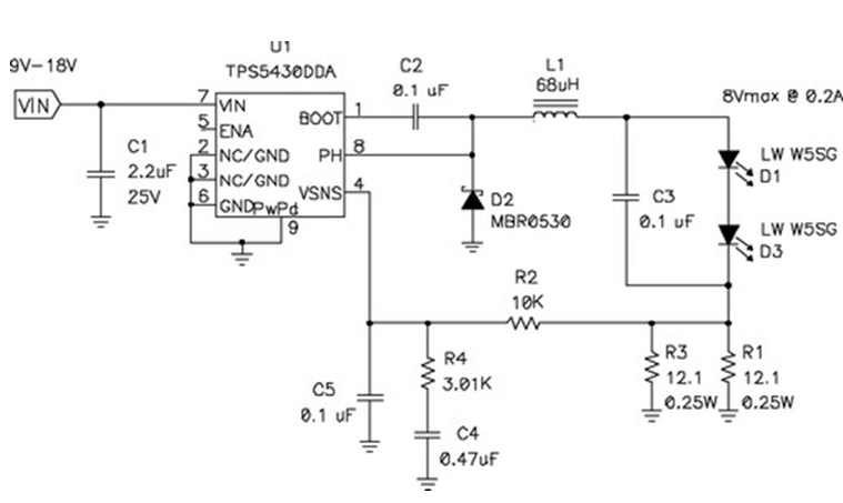 在輸出電壓始終小于輸入電壓的情況下,應(yīng)使用降壓穩(wěn)壓器,圖5顯示了該拓撲結(jié)構(gòu)。在該電路中,對電源開關(guān)的占空比 (duty factor) 進行了控制,以在輸出濾波器電感 L1 上確立平均電壓。當FET開關(guān)閉合時(TPS5430 內(nèi)部),其將輸入電壓連接到電感器,并在L1中構(gòu)建電流。D2為環(huán)流二極管 (catch diode),可提供開關(guān)斷開時的電流路徑。電感器可對流過LED的電流起到平滑的作用,該工作可通過用電阻監(jiān)控(測量)LED電流,并將電壓與控制芯片內(nèi)部的參考電壓進行比較,最終進行調(diào)節(jié)。如果電流太低,則占空比增加,平均電壓也上升,從而也導致了電流的升高。該電路具有極佳的效率,因為電源開關(guān)、環(huán)流二極管以及電流感測電阻上的壓降非常低。