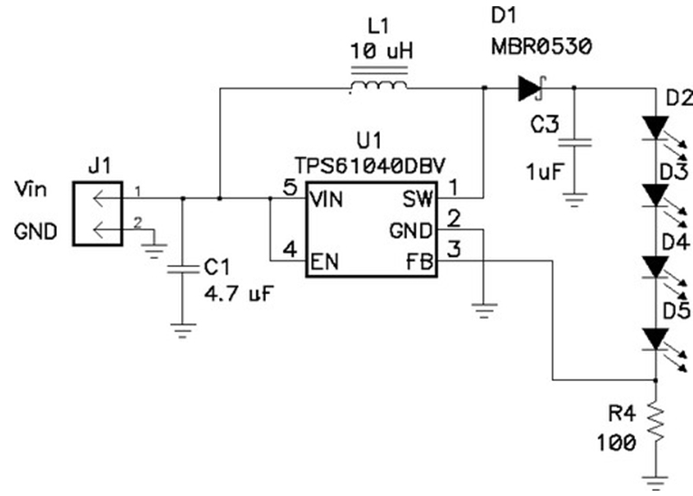 當輸出電壓總是比輸入電壓大時,最好采用升壓轉(zhuǎn)換電路,如圖6所示。該電路的U1有一個帶有控制電子器件的高度集成的電源開關(guān)。當開關(guān)閉合時,電流流過電感器到接地。當開關(guān)斷開時,U1的引腳 1 電壓會升高,直到D1導通。然后電感器放電,電流進入輸出電容器(C3)和LED串。在絕大多數(shù)應(yīng)用中,C3通常用于平滑LED電流。如果沒有C3,則 LED電流將是斷斷續(xù)續(xù)的。也就是說,它會在零和電感電流之間切換,這會導致 LED 熱量增加(從而縮短使用壽命),亮度減少。在前面的例子中,LED 的電流是通過一個電阻感測的,并且占空比會發(fā)生相應(yīng)的變化。請注意,本拓撲存在一個嚴重的問題,即它沒有短路保護電路。若輸出短路,則會有較大的電流通過電感器和二極管,從而導致電路失效,或者輸入電壓崩潰。