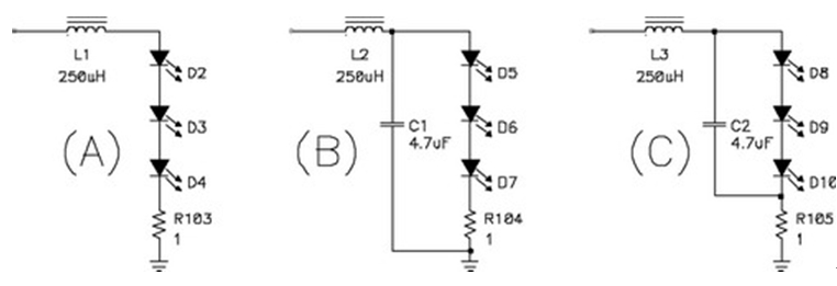 關(guān)閉 LED 電源上的電流環(huán)路比關(guān)閉傳統(tǒng)電源上的電壓環(huán)路簡單。環(huán)路的復雜性取決于輸出濾波器的配置。圖8顯示了三種可能的配置:只有一個簡單電感器的濾波器(A);一個典型的電源濾波器(B);以及一個修正后的濾波器(C)。