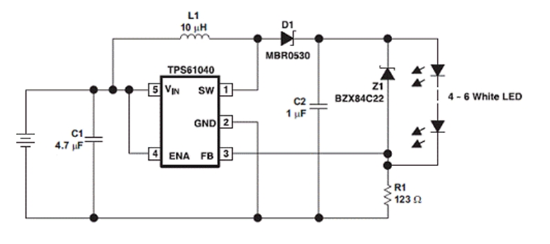 以下電路可生成 101mA 的恒定電流,能為 PDA 和數(shù)碼相機(jī)等便攜式應(yīng)用驅(qū)動(dòng)高達(dá) 6 個(gè)白色 LED">LED。其輸入電壓工作范圍為 1.8 V 至 6 V,可以采用兩節(jié)堿性電池或鎳氫電池輸入(1.8 V 到 ~3 V)、三節(jié)堿性電池或鎳氫電池輸入(2.7 V 到 ~4.8 V)以及單體鋰離子電池輸入(3 V~4.2 V)。這種升壓轉(zhuǎn)換器采用 R1 來設(shè)置流過 LED">LED 的恒定電流。TPS61040 產(chǎn)品說明書 (SLVS413) 給出了本電路的詳細(xì)描述。