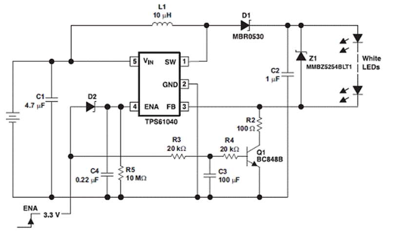 許多采用白光 LED">LED 照明和背光的消費(fèi)類產(chǎn)品都支持開關(guān)時(shí)的漸進(jìn)性 LED">LED 發(fā)光變化。這種漸進(jìn)性的發(fā)光變化通常要借助可提供 PWM 發(fā)光變化控制功能的微處理器來完成。在此,我們將介紹一款采用德州儀器 (TI) TPS61040 白光 LED">LED 驅(qū)動(dòng)器的電路,其在不使用微處理器的情況下同樣也可以實(shí)現(xiàn)開關(guān)時(shí)的漸進(jìn)性發(fā)光變化。