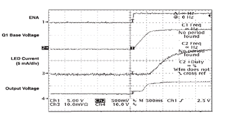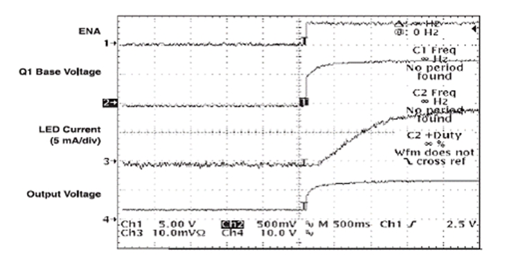 應(yīng)用使能信號(hào) (enable signal) 時(shí),R3 將慢慢給 C3 充電,此舉會(huì)慢慢開啟 Q1。TPS61040 會(huì)通過 D2 被立即啟用。在電路閉合時(shí),F(xiàn)B 到接地的初始電阻極高,從而將 LED">LED 電流限制為 0 mA。隨著 Q1 慢慢開啟,有效電阻逐漸下降,電阻的下降與 LED">LED 電流的升高有直接的關(guān)系。LED">LED 從亮度為 0% 變?yōu)?100% 的亮度,需時(shí) 1 到 2 秒鐘,具體的時(shí)間長短取決于選定的時(shí)間常數(shù)。圖 3 顯示了電路閉合時(shí)的相關(guān)波形。