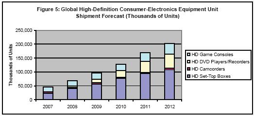 - 到2012年, 52.9%的付運機頂盒、攝像機、DVD播放機和游戲機都會支持高清晰度,2008年只有21.6%