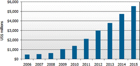 圖一 : 2006-2015 全球OLED面板出貨金額與預(yù)測(cè)