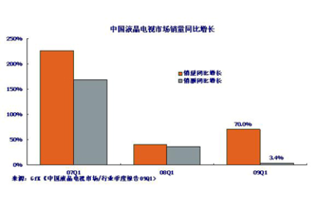 GfK中國發(fā)布的《液晶電視產業(yè)市場季度報告(09Q1)》顯示:2009年1季度,中國液晶電視市場出現了反彈,銷量達到476萬臺,比2008年1季度增長了約70%。