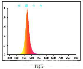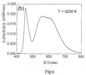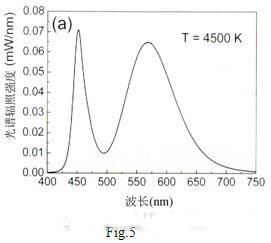 以InGaN藍(lán)光LED和1號(hào)熒光粉制成的白光LED的發(fā)射光譜示如Fig.6,其光效為55lm/W,色溫4500K。這是本人所知道白光LED的最高光效報(bào)導(dǎo)(據(jù)測試國內(nèi)1W白光LED的光通量大多在40lm以下)。采用2號(hào)和3號(hào)混合熒光粉試制的白光LED的發(fā)射光譜示如Fig.7,其顯色指數(shù)提高到82,色溫4200K,但光效確降低到20lm/W。