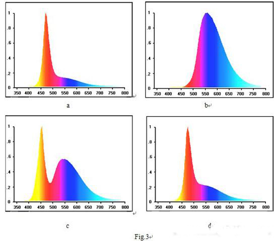 我們曾對(duì)此進(jìn)行了實(shí)驗(yàn)研究,我們利用某公司生產(chǎn)的1W高亮度藍(lán)光LED,其光譜的中心輻射波長為470nm見Fig.3,去除外封裝后分別涂敷不同厚度的輻射的中心波長為560nm的黃光熒光粉涂層,經(jīng)處理后測量其發(fā)射光譜。從二十余種不同厚度的樣品中選擇了四種典型情況,其結(jié)果見Fig