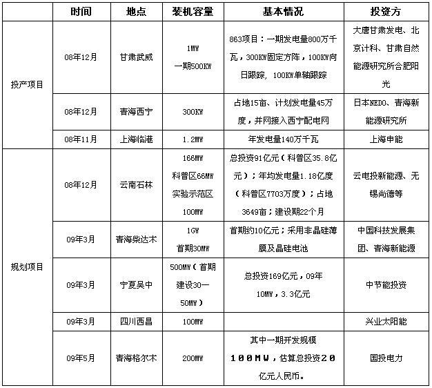 受國家政策的導(dǎo)向,從2008年底到2009年上半年,全國上馬了多個(gè)大型并網(wǎng)電站項(xiàng)目,如青海柴達(dá)木的1GW光伏電站項(xiàng)目、青海格爾木的 200MW光伏電站項(xiàng)目、寧夏吳中的500MW光伏電站項(xiàng)目等,盡管目前國家只批準(zhǔn)了三個(gè)光伏電站項(xiàng)目包括上海崇明島1MW項(xiàng)目、255千瓦的內(nèi)蒙古鄂爾多斯項(xiàng)目和甘肅敦煌的100MW項(xiàng)目,而以上新上馬的項(xiàng)目還有待國家的批復(fù)。