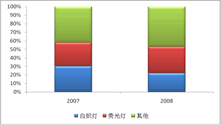 中國電光源的細分市場有白熾燈、熒光燈、特種燈泡等。其中2008年中國白熾燈的產(chǎn)量是34億只,較2007年同期減少23%;熒光燈產(chǎn)量為48億只,較2007年增長14%。2007年以來國家環(huán)保政策力度加大,不斷推廣節(jié)約用電。預計未來中國熒光燈產(chǎn)量持續(xù)保持上升,電光源產(chǎn)品結構趨于優(yōu)化。