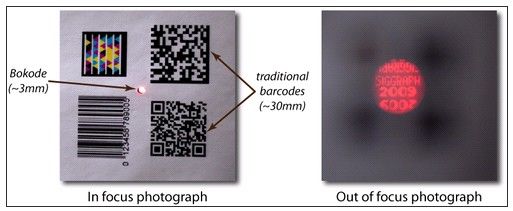 Bokode設(shè)計(jì)從角度來形成及解讀信息,這使得標(biāo)準(zhǔn)相機(jī)看世界的方法和人眼迥異,并可以從遠(yuǎn)距偵識(shí)出物體的身份及和光學(xué)標(biāo)簽的相對(duì)角度。因?yàn)锽okode它讓使用者可以從很遠(yuǎn)的地方利用現(xiàn)有設(shè)備讀取信息,因此較傳統(tǒng)條形碼更有用,彈性更大。