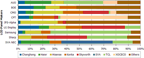 - 根據統(tǒng)計數(shù)據分析Skyworth與TCL的面板供貨商相對集中,以Skyworth來說,估計有90%面板來自CMO與LG Display二家面板廠;而 TCL估計有將近85%面板來自于Samsung與AUO。