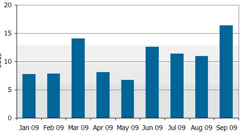 根據(jù)DisplaySearch最新大尺寸公共顯示器終端銷售調(diào)研報(bào)告指出,大尺寸非消費(fèi)性液晶顯示器(指26寸及以上尺寸)在2009年第三季銷售量超過20萬臺(tái)創(chuàng)歷史新高,較上季成長41%,并較去年同期成長19%。以月份來看的話,9月份的商用等級(jí)顯示器銷售量較8月份成長了49%,也創(chuàng)下單月銷售量最高的紀(jì)錄。