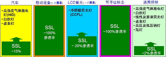 如今,在屏幕尺寸小于4英寸的手機、相機閃光等移動設備應用中,及路邊及體育場中大型顯示屏應用中,LED照明,或稱固態(tài)照明(SSL),幾乎占據(jù)了100%的份額。除此之外,LED照明也向其它領(lǐng)域邁進。如在汽車應用中,LED照明占據(jù)約15%的份額。而在較大液晶顯示屏(LCD)背光應用中,雖然冷陰極熒光燈(CCFL)如今仍然占據(jù)主導地位,但LED照明的總滲透率也達到約20%,參見圖1。特別是在備受矚目的大尺寸液晶電視背光應用中,據(jù)Laurent Jenck指出,預計LED背光的液晶電視在未來3到4年間,將占據(jù)至50%的份額。