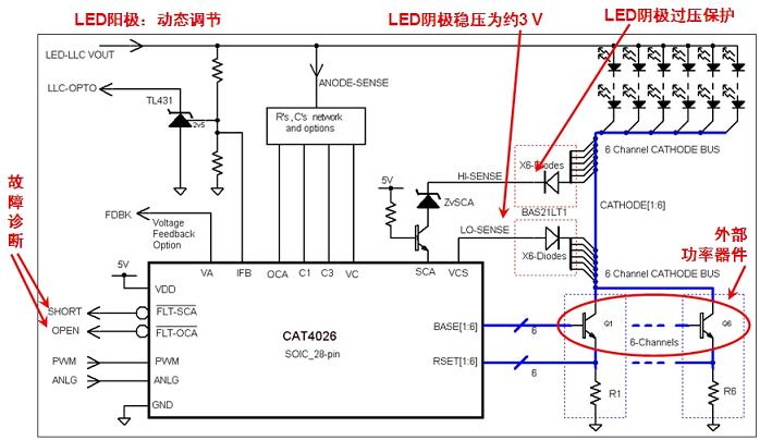 其它應用,如建筑物照明中,同樣可以采用安森美半導體的高能效LED驅(qū)動方案,如CAT4103、CAT4109三通道線性恒流驅(qū)動器是高亮度RGB LED驅(qū)動器,應用于新興的高亮度、高視覺沖擊力LED建筑物照明中的RGB LED像素控制。而CAT4106是多通道升壓型LED驅(qū)動器,適合較大尺寸的通用LCD背光應用,能夠驅(qū)動多達40個白光LED,提供總計達6 W的LED輸出功率,并幫助設計人員提升背光能效至最高。此外,采用LED背光的大尺寸液晶電視日趨多,其中尤以側(cè)光式LED背光為主,通常需要采用6個單串的LED光條(每串LED視為一個LED道)?,F(xiàn)有6通道側(cè)光式LED電視中每個LED通道均含有專用驅(qū)動器IC、電感型DC-DC升壓轉(zhuǎn)換器及及開關(guān)。而安森美半導體應用于大尺寸側(cè)光式LED背光液晶電視的多通道線性LED驅(qū)動器CAT4026是一種高性價比方案,支持高數(shù)量的通道,能以單顆IC控制6個LED通道,能效目標范圍高于90%,能效典型值量多達94%,且針對 LED開路和過多LED短路等故障條件提供保護。CAT4026的簡略應用示意圖參見圖2。