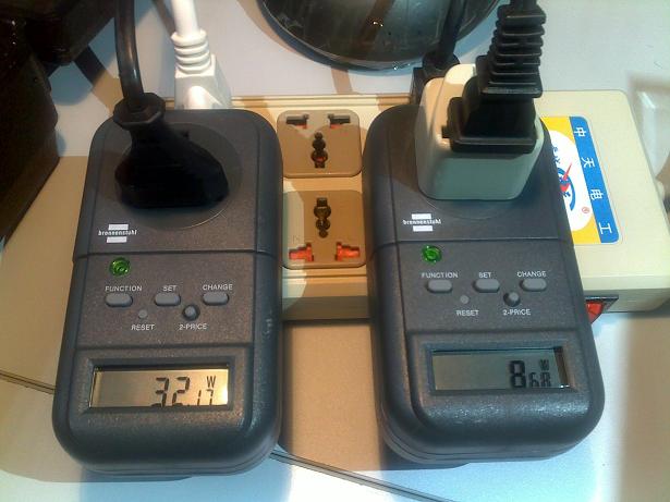 圖4.左邊為鹵素臺燈的能耗為32.17W,右邊為LED燈的能耗為8.68W