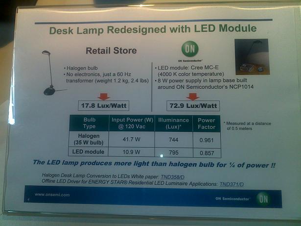 現(xiàn)場,Laurent為我們演示了用LED模塊代替鹵素臺燈在能效方面的差異,如下圖所示:可以看出,使用LED燈作臺燈的能耗僅相當于鹵素燈的1/4。