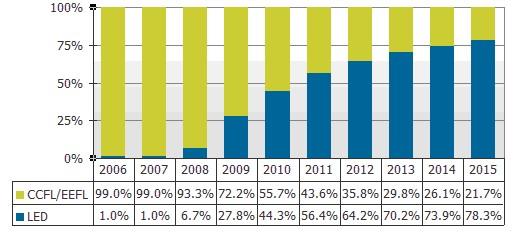 2006-2015采用傳統(tǒng)CCFL&EEFL燈管與LED背光大尺寸液晶面板出貨比率預(yù)測(cè)