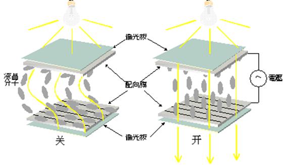 圖2是液晶點(diǎn)陣(像素點(diǎn))的工作原理圖,在沒(méi)有驅(qū)動(dòng)信號(hào)的情況下,液晶分子按一定扭曲角排列,因此,光線很難通過(guò)液晶;在驅(qū)動(dòng)信號(hào)的作用下,液晶分子就會(huì)被極化帶電,極化帶電的液晶分子就會(huì)按電力線的方向有序地進(jìn)行排列,即扭曲角將會(huì)變小,這樣光線就很容易通過(guò)。液晶顯示器就是通過(guò)控制液晶分子的扭曲角大小,從而控制光的穿透強(qiáng)度來(lái)工作的。