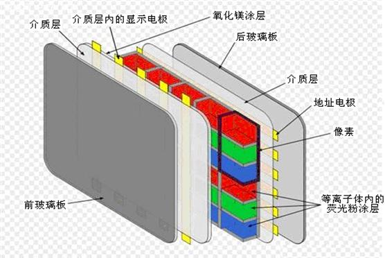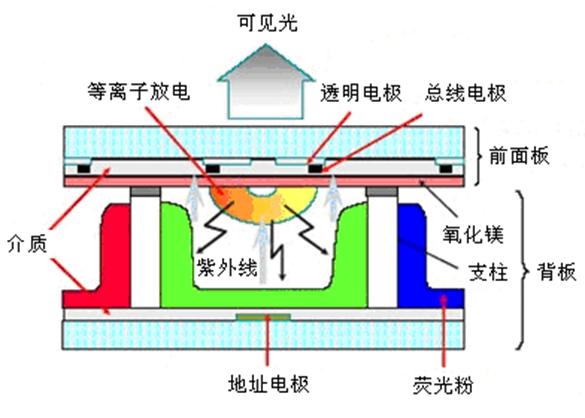 PDP是Plasma Display Panel的簡(jiǎn)寫,也就是等離子體顯示器。PDP顯示器的工作原理是,通過(guò)加電,讓等離子汽體(一般為惰性氣體)在強(qiáng)電場(chǎng)中放電產(chǎn)生紫外線,然后通過(guò)紫外線激發(fā)熒光粉發(fā)光,PDP顯示器的工作原理如圖5所示,其結(jié)構(gòu)如圖6所示。