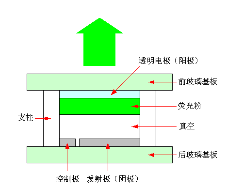 SED(Surface-conduction Electron-emitter Display)顯示器是東芝公司的技術(shù),目前大家都公認(rèn),SED顯示圖像的質(zhì)量水平是最好的。它采用表面?zhèn)鲗?dǎo)電子發(fā)射顯示技術(shù),屬于場(chǎng)致發(fā)射顯示,是一種主動(dòng)發(fā)光的顯示技術(shù)。SED顯示器前玻璃基板上涂有紅、綠、藍(lán)三色熒光粉,并作為陽(yáng)極相對(duì)后玻璃基板加有幾千伏的高壓。通過(guò)絲網(wǎng)印刷法在后玻璃基板上制作對(duì)應(yīng)每個(gè)像素的金屬電極,并用噴墨印刷的方法在金屬電極間制作氧化鈀薄膜電子發(fā)射陰極。生成了氧化鈀膜的金屬電極間距只有4-6納米,當(dāng)金屬電極間加上十幾伏的電壓后,極間將形成超高電場(chǎng),氧化鈀膜中的電子會(huì)被牽引出來(lái),形成電子發(fā)射。