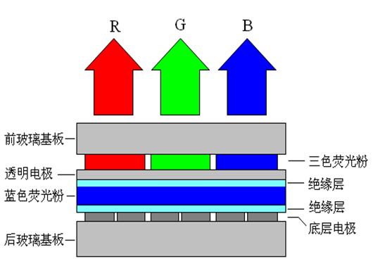 TDEL(Thick-film Dialectric Electroluminescent Technology)顯示器的原理是在兩個(gè)極板之間(其中一個(gè)極板是透明電極),安置一整片藍(lán)色場(chǎng)致發(fā)光材料,再在其上面再分別安置紅色和綠色顏料,混合成三色的RGB影像。由于不須要像等離子電視一樣復(fù)雜的組件,也不須要LCD的背光,37"的TDEL電視樣品厚僅2cm,重量則甚至不到一公斤。從技術(shù)性能以及性能價(jià)格比方面進(jìn)行比較,TDEL顯示器要比PDP和LCD顯示器好,應(yīng)該說(shuō)是一項(xiàng)比較有發(fā)展前途的平板顯示器,但由于產(chǎn)業(yè)鏈遲遲建立不起來(lái),所以很少人使用。圖8是TDEL顯示器的工作原理圖。