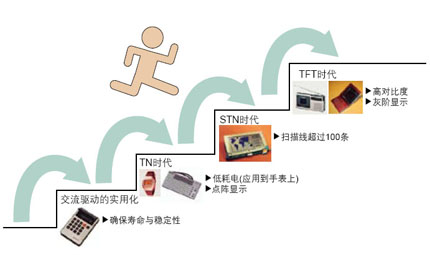 夏普公司的液晶計(jì)算器上采用的液晶顯示屏是由RCA公司生產(chǎn)的DSM(動(dòng)態(tài)散射模式) 液晶,而不是目前常見的TN(扭曲向列)模式液晶。但是,要采用DSM制造液晶電視是很困難的,這是因?yàn)镈SM的點(diǎn)陣顯示掃描線在數(shù)量方面存在一定的限制。1971年出現(xiàn)的TN 模式解決了這個(gè)問題。TN液晶能起到快門的作用,通過使液晶分子在電場(chǎng)中移動(dòng),就可以控制光的開/關(guān)。目前,幾乎所有液晶顯示屏都在采用這個(gè)工作原理。