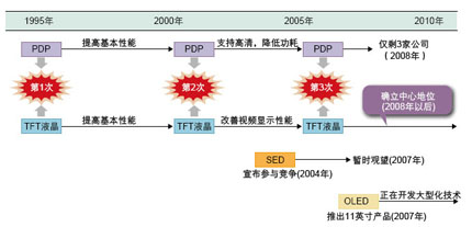 在液晶顯示器市場(chǎng)剛開始啟動(dòng)的1998年,當(dāng)時(shí)的夏普公司社長(zhǎng)(現(xiàn)任董事長(zhǎng))町田勝彥的發(fā)言震驚了整個(gè)行業(yè)。他表示: “到2005年,夏普在日本國內(nèi)銷售的電視將全部采用液晶屏。” 當(dāng)時(shí),液晶電視并未普及,在夏普公司內(nèi)部對(duì)于彩色液晶屏也并沒有十足的把握。但是,這一句話成為液晶電視掃蕩市場(chǎng)的導(dǎo)火索,那以后,液晶電視以超乎町田勝彥預(yù)想的驚人速度推廣開來。在此過程中,液晶與PDP(等離子)、SED(表面?zhèn)鲗?dǎo)電子發(fā)射顯示)等技術(shù)展開了激烈的競(jìng)爭(zhēng)(見圖3)。