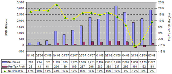 在2009年上半年,生產(chǎn)能力過剩和整個供應鏈的供過于求,造成太陽能發(fā)電系統(tǒng)的平均價格降幅達25%以上。然而低價格的刺激,較為容易的融資環(huán)境,以及需求的多樣化,加上各個國家及區(qū)域新的獎勵政策推出,讓主要的廠商在2009年第三季順利轉(zhuǎn)虧為盈。