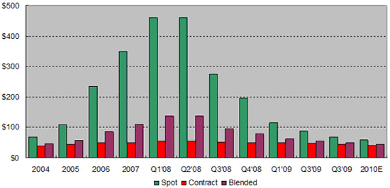 太陽能電池制造商把重點放在降低成本以維持一定獲利率的同時,也將持續(xù)推動電價往Grid Parity (太陽發(fā)電成本與傳統(tǒng)發(fā)電成本相當)的方向進行。主要降低成本的方法包括使用較少的硅,或使用較便宜的硅。多晶硅(Polysilicon)是主要用于制造結(jié)晶硅(c-Si)太陽能電池的晶圓材料。而其占到整體太陽能模塊成本的15%到20%。由于大量多晶硅新產(chǎn)能的開出以及過去這一年的需求減少,硅晶的價格自2008年下半年起因供過于求而大幅下跌,目前雖然跌勢已經(jīng)趨緩,但預計2010年仍為供過于求的狀況,因此價格將持續(xù)下降。圖2為多晶硅價格趨勢。