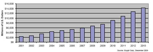 到2013年,全球LED市場(chǎng)將達(dá)到143億美元,比2009年增長(zhǎng)近一倍。
