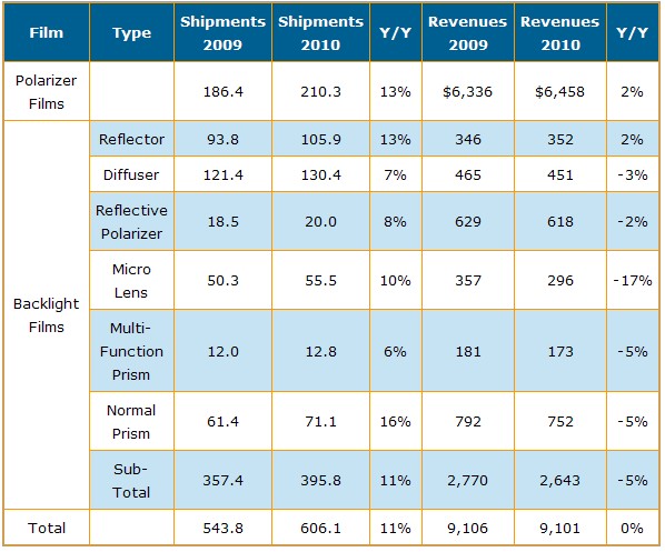 根據(jù)DisplaySearch在光學膜領域調(diào)研指出,2009年全球TFT LCD用光學膜出貨面積估計達到5億4千3百萬平方米,同時預估2010年光學膜出貨將持續(xù)增長到6億零6百萬平方米,年成長率將達11%。不過由于平均銷售價格不斷下滑,我們估計2010年出貨金額將與今年持平在91億美元水平。另一方面隨著綠色顯示器需求與LED背光市場增長驅(qū)動新一波背光設計發(fā)展,使得如棱鏡片(prism films)、反射式偏光片(reflective polarizers)或者micro-lens films等產(chǎn)品的需求也跟著提高;對于能持續(xù)提高技術能力的廠商提供較佳市場機會。