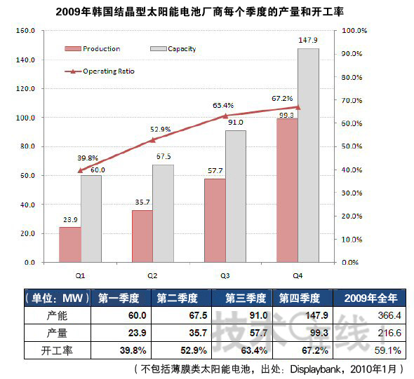 Displaybank稱(chēng),韓國(guó)廠商設(shè)備開(kāi)工率的上升,主要得益于以德國(guó)為中心的歐洲市場(chǎng)上太陽(yáng)能電池需求的改善。不僅是設(shè)備開(kāi)工率,生產(chǎn)能力也得到了大幅上升。具體而言,產(chǎn)能由2009年第一季度的60MW,迅速攀升至2009年第四季度的147.9MW。Displaybank預(yù)測(cè),如果今后繼續(xù)保持這一趨勢(shì),2010年第一季度的開(kāi)工率將提高至70%。