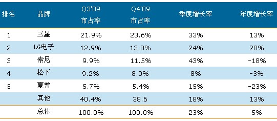 LG為2009年第四季的全球電視市場(chǎng)銷(xiāo)售金額的第二名,而在前五名之中LG是增長(zhǎng)最快的。LG的2009年全年銷(xiāo)售金額占有率達(dá)到了13.2%,較2008年整整增長(zhǎng)了2個(gè)百分點(diǎn)。