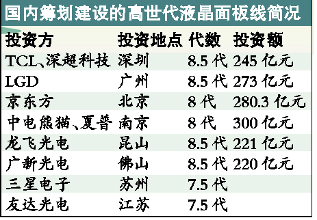 截至目前,國家發(fā)改委批準的高世代液晶生產(chǎn)線項目有昆山的龍飛光電、深圳的華星光電以及北京的京東方等國內(nèi)企業(yè)主導的項目,日本和韓國企業(yè)的項目還在焦急等待。