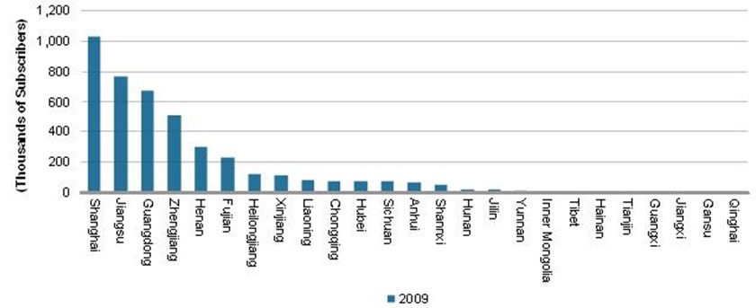 IPTV服務(wù)目前已擴(kuò)展到中國的20多個省市,但I(xiàn)PTV用戶只集中在少數(shù)幾個地區(qū)。在中國的22個省中,IPTV用戶超過10萬的不到八個。而且,全部IPTV用戶中有整整56%只集中在三個地區(qū):中國最大城市上海,以及人口密集的東部省份江蘇和南部省份廣東。