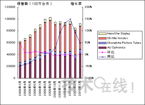 圖1:臺灣四大液晶面板廠商的銷售額走勢(2009年3月~2010年3月的業(yè)績)。